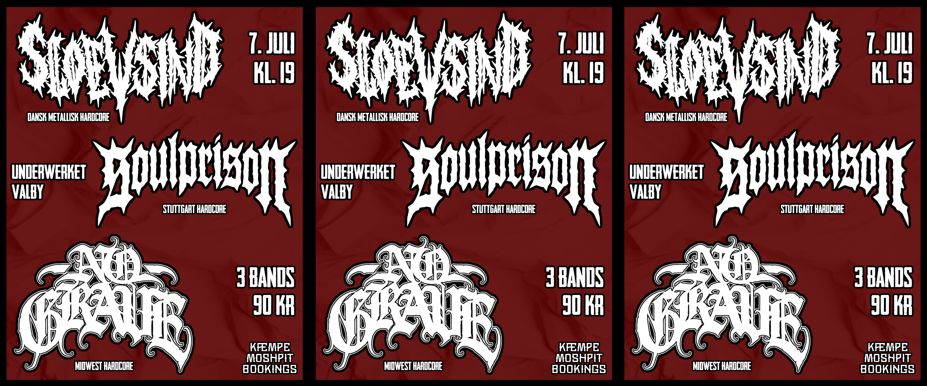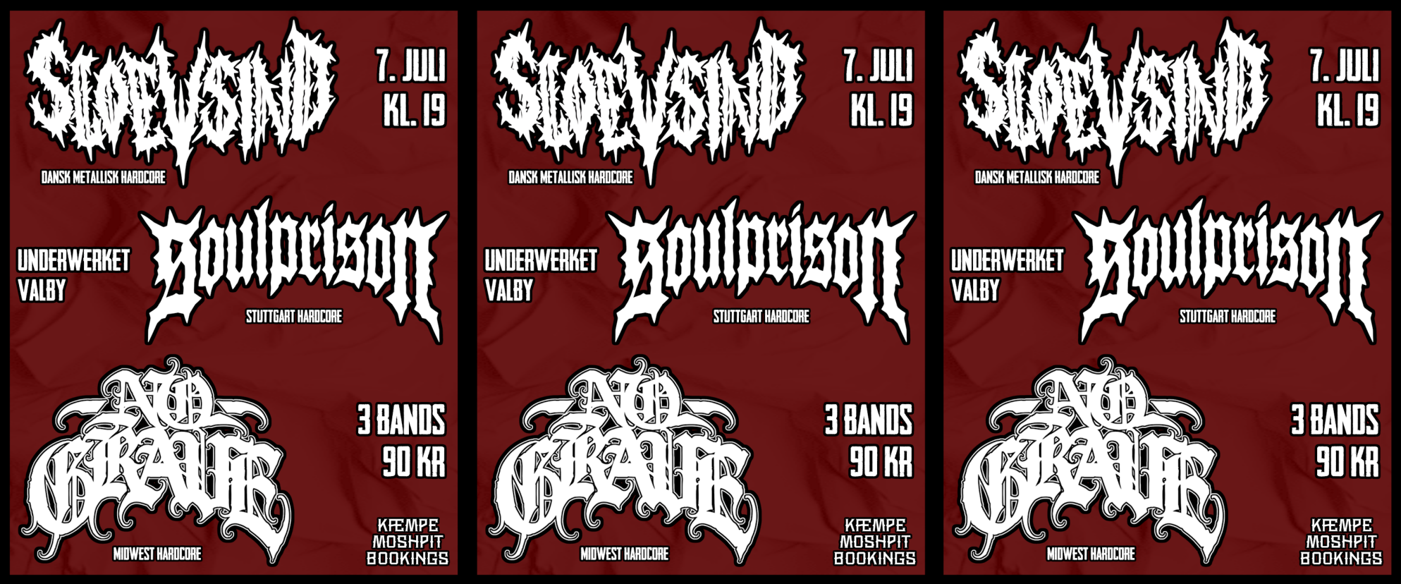 Så er der dømt hardcore i Underwerket igen! SOULPRISON og NO GRAVE svinger forbi Danmark på deres forestående fællestour, og bliver tilsluttet af SLOEVSIND, som fuldender en vaskeægte hardcoretreenighed i kælderen. Sæt kryds i kalenderen – den 7. juli går det ned!
