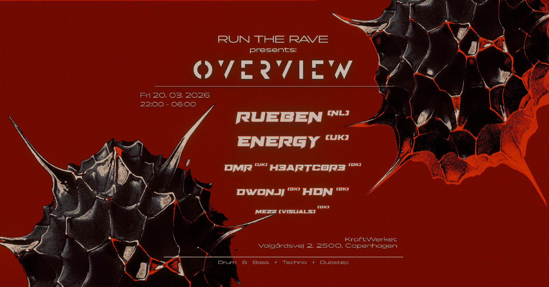 RUN THE RAVE is back with a new residency at KraftWerket [UnderWerket]. RUN THE RAVE has hosted a series of events around Denmark and is known for a wide spectrum of bass music combined with stunning visuals. Now they are ready to take things to the next level and bring you their most exciting booking yet: three artists representing the UK forward-thinking Drum & Bass label, Overview Music: Rueben, DMR, Energy (first time in DK).