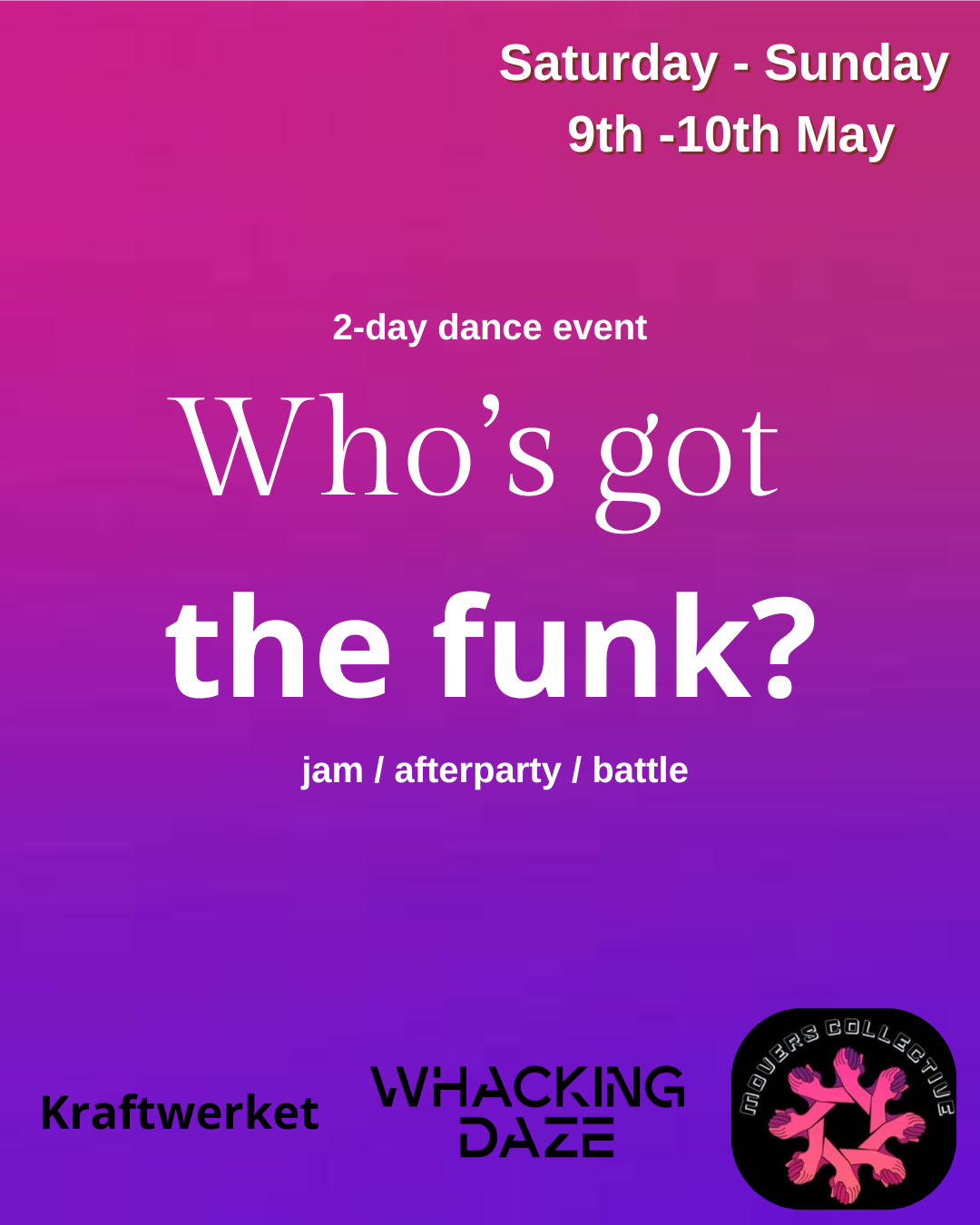 Who's Got the Funk!, is a dance event that focuses on dance funk styles such as popping, locking, and whacking - all of which have strong cultural roots with the purpose of establishing a feeling of freedom through dancing.